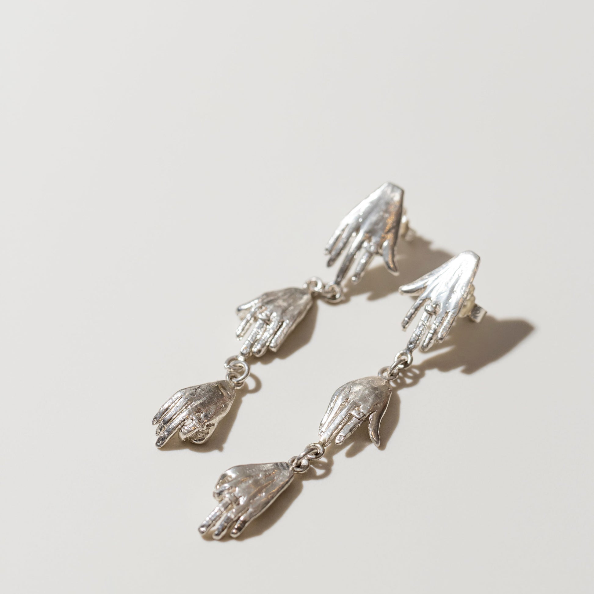 Una serie de manos en progresión que caen suavemente, creando un movimiento vertical escultórico. Livianos, conceptuales y con ritmo.